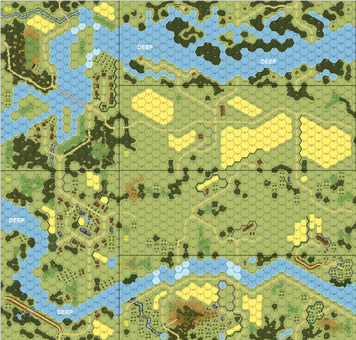 Right off the bat we both made two big mistakes. I tried to ram my way to the 44X1 building by charging straight ahead like a bull and paid the price badly to the tune of 3.5 lost squads, a Panther, two burned DCs, two stunned HTs, and a broken MA. I lost a further 2 squads during his part of the turn. I would've been much better off making directly for the grainfields to the north and/or the buildings to the south and consolidating for a future attack. For his part, John let me on almost completely unopposed in the west, allowing my motorcade of HTs to reach the safety of the wooded road en route to their mission of grabbing the SW village. Turn 2 saw one of my precious ACs recalled from a sniper hit, the only consolation being he had already busted his MA. The Americans lost two mortars to permanent malfs. My second motorcade also made for the SW village, but I sent a rogue Panther to try and glean out the OBA observer. When a BAZ shot dudded against him John got desperate and dropped the boom not only on it, but also himself. And so ended that threat, to my great joy. John will be the first to admit his phone was very poorly placed to begin with. Turn 3 saw my men who had been wading through the shallows across the island be joined by some of my second motorcade to entirely secure the HQ outpost, grabbing the first of what would be a plethora of POWs (the only chance the Germans have to win this). I lost my second HT to a big stun, and another to a MG shot (a constant nuisance throughout the game), but he lost another mortar and two BAZ. In the east my men were lining the hedgerow, waiting for their brethren in the west to get in position to begin the encirclement process, and I had almost entirely secured the SW village. Things were looking up, but he of course got his reinforcements; and thus would begin the 3-board LOS headache of constantly watching my flank. Turn 4 saw more Amis rounded up and me lose another two HTs (one to stun and one to knockout), but was otherwise fairly quiet as I prepared my forces for full-on assault. Turn 5 saw two Ami AT guns go down, another lost mortar, and the first German infantry casualty in three turns when a berserk HS was shot down by the sniper before he could even cause havoc. 44X1 finally fell, and the pincers were beginning to close on Board 16. Turn 6 saw another German HS lost, more Ami POWs rounded up, and Board 16 and 44 begin to be assailed in erneast. Turn 7 saw a gaggle of POWs taken as Board 16 was secured and the 44M3 area just about. Next was R7-S7-S8, which was now enshrouded in smoke and feeling some OBA love. Turn 8 was yet another beatdown for the Amis, but R7-S7-S8 was still holding tight, and the last house on the left was going to be a tough nut to crack in only one turn. One big complaint I have about this scenario is that, by the end, just about every single German infantry unit will be toting POWs, and they simply cannot spare a single one (let alone 5-6) to run them off the board. If just one of these manages to escape and re-arm they could grab a bunch of unprotected buildings. Anyway, I digress. Turn 9 saw me secure R7-S7-S8, but John had wisely been able to ring 40R1 with a wall of bodies. None of my options were good. If I smoked him in I'd have to drive through Ami defenders and face CC with two Ami squads and a 8-1; if I dropped OBA I'd not only have to hope it did the job, but also quite possibly have to weather it myself. After much consideration I decided for the latter, thinking if I got lucky enough to clear even a one hex path I might have enough to throw at it and have somebody survive. When OBA did almost nothing I threw in the towel. A bit of an anticlimactic finish since I foresaw this seven turns before when the Ami reinforcements hit the map. It was a fun experience, but neither of us would be in any hurry to play this one again. For John's part it just couldn't have been very fun being a pincushion for 8/10 turns; for my part it made my head hurt pushing around the scads of vehicles all game long (and then having to watch their backs). We played it in 32 hours, just slightly under the estimated play time. Not an exact count, but VP were roughly Ami=100 (about half south of the river), Ger=140 (about 100 POW).