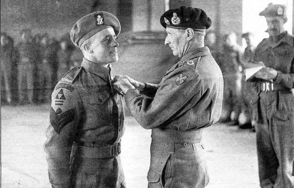Company Quartermaster Sergeant WJ Sharkey receiving his DCM from Montgomery awarded for his gallantry during the approach to Troarn