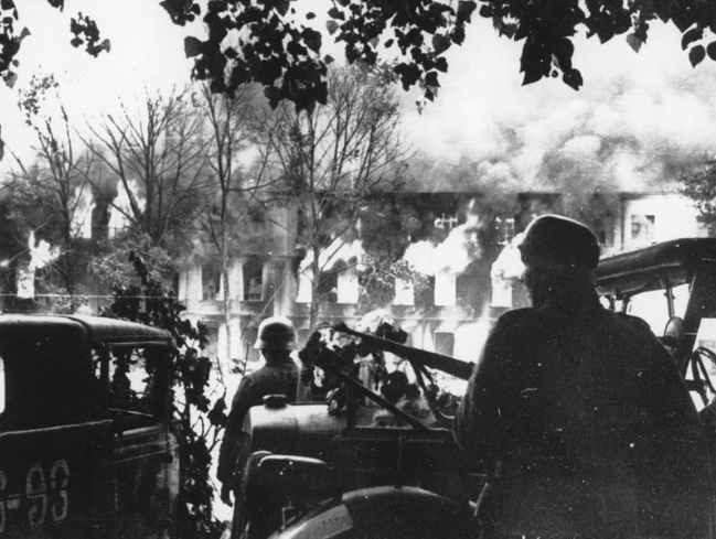 Flames shoot high from burning buildings in the background as German troops enter the city of Smolensk