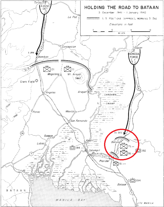 The commander of the Japanese 48th Division, General Tsuchibashi ordered a small task force of infantry and armor to remove the American defenses around the Calumpit bridges. The unit defending this area was General Jones’ U.S. South Luzon Force. General Jones ordered the withdraw of the defending units. The 71st Infantry Division PA had already withdrawn and the 91st Infantry Division PA was executing a fighting withdraw when the main thrust of the Japanese attack hit them. They received armor support from the 192nd Tank Battalion and some 75mm self-propelled mount, halftracks. Through heavy fighting, with tank on tank combat in the streets, the U.S. forces were able to withdraw, thanks to the actions of the rear guard.Attacker: Japanese (Elements I/2nd Formosa Infantry Regt. & 7th Tank Regt., 48th Division)