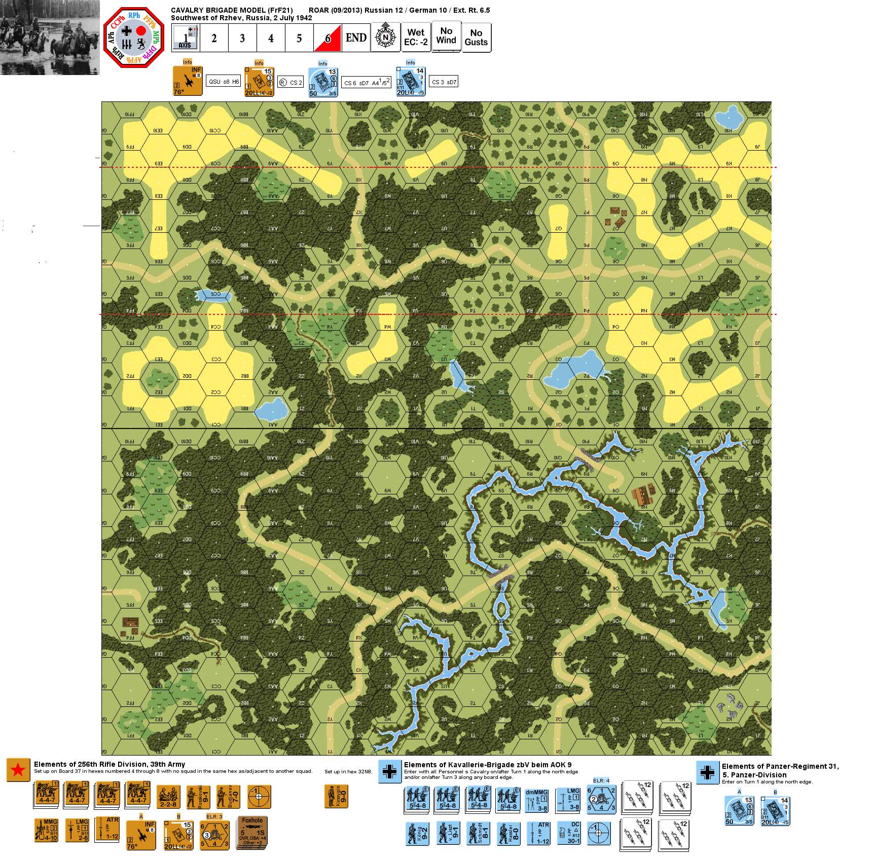 The Russian 39th Army was firmly entrenched in the inaccessible primeval forests between Belyi and Rzhev. Recently pocketed by a German attack cutting their last supply route, this army was scheduled for destruction. Attacking along the Wjasma road towards the south-west was Kavallerie-Brigade zBV beim AOK 9, a brainchild of Generaloberst Walter Model and created specifically for this operation. Made up of reconnaissance battalions from Model's infantry divisions, the brigade was a crack outfit designed to handle the swampy forest terrain. - - - - In "Cavalry Brigade Model", German cavalry must prevent elements of a Russian rifle division from withdrawing in good order to their secret rallying point. To ensure success, the Germans may need to rely more on maneuver than fire.Attacker: German (Kavallerie-Brigade AOK 9 and Panzer-Regiment 31, Panzer-Division 5)