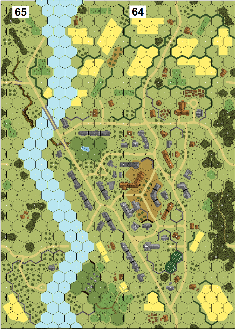 I contested the Germans strongly, like a beach landing, with just about every possible entry hex covered with potential fire. This would put me at risk of being subjected to some substantial return fire, but that's what commissars are for, and I had three of them. The 9-0 was wounded, but the Kubelwagan, gun, and crew were eliminated, and a few broken Gemans (including the HMG squad) had to run home to mommy. Turn 2 saw my 7-0, whose job was to help tote a MMG, taken out by a sniper. But the German 9-2/HMG/MMG stack were delayed with a pin result, keeping them off the front line for one more turn. Delay was the name of the game here, and my men did a good job of it, with the Germans making little forward progress on Turn 3. Turn 4 saw my tank guarding the western peninsula lose its MA for good, while the rest of our men out there continued to duke it out around the walled orchard. My 10-0 was gunned down trying to make a break across the east central streets, leaving that side of the board leaderless for me, except for the wounded 9-0 who was needed to help haul around the last MMG (the other being lost for good on a failed fix the turn before). Thankfully a bunch of dummies soaked up a lot of the remaining German fire. Turn 5 saw the Germans shrug off their first minefield find, my men tenuosuly cling to their meager hold in the middle, while the battle in the walled orchard in the west waged on. Turn 6 finally saw the Germans break free in this area (with Russians hot on their heels), but it would be too little too late. My central defense toughened up for one more turn of precious delay. With the continuous fighting withdrawl of the Russians, the German radio really had no time or place to get into position. When it finally was ready to drop some smoke it lost its dial. The Germans in the center were finally freed up to gain a bit of ground, but with lots of wire and a secondary Russian line of defense to get past there was really no chance to make it to the bridge, let alone claim it, so they conceded. Quite a fun scenario, with the multiple battlefronts entertaining. Beware of shots across the river!