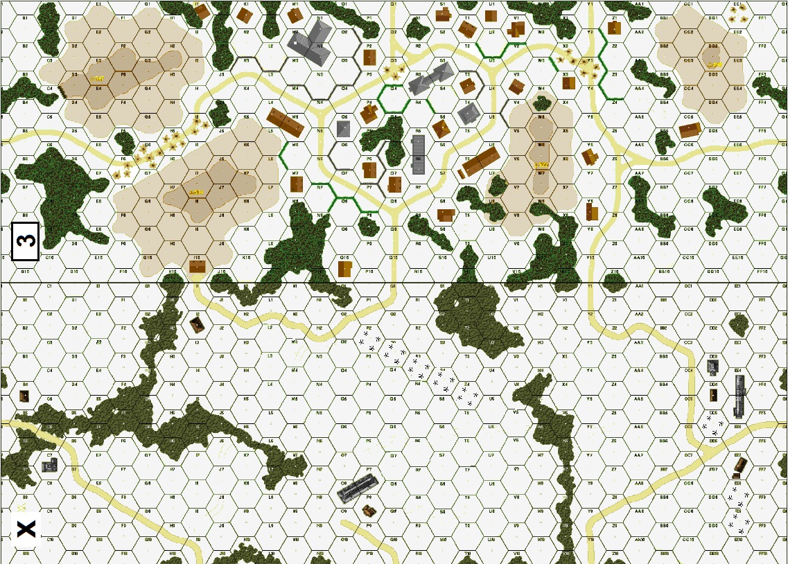 The weather turned once more as a cold front moved in from Siberia, freezing the ground and allowing vehicle movement. The Soviets immediately launched an attack with their spearheads, stabbing deep into the fragile German line. The crossroad village of Swinne became a fiery cauldron, as its importance in the control of movement was well identified on both German’s and the Soviet’s maps…Attacker: Russian (Elements of the Soviet 70th Motorized Brigade)
