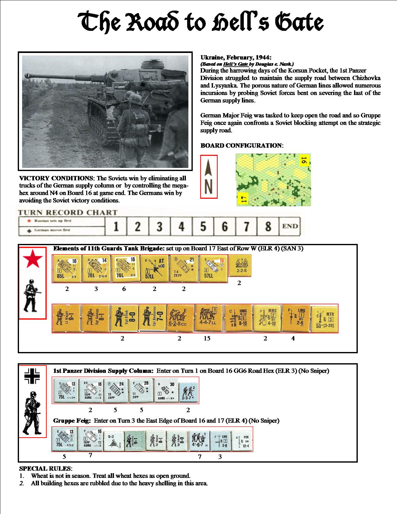 During the harrowing days of the Korsun Pocket, the 1st Panzer Division struggled to maintain the supply road between Chizhovka and Lysyanka. The porous nature of German lines allowed numerous incursions by probing Soviet forces bent on severing the last of the German supply lines. German Major Feig was tasked to keep open the road and once again confronted a Soviet blocking attempt on the strategic supply road.Attacker: German (1st Panzer Division Supply and Gruppe Feig)