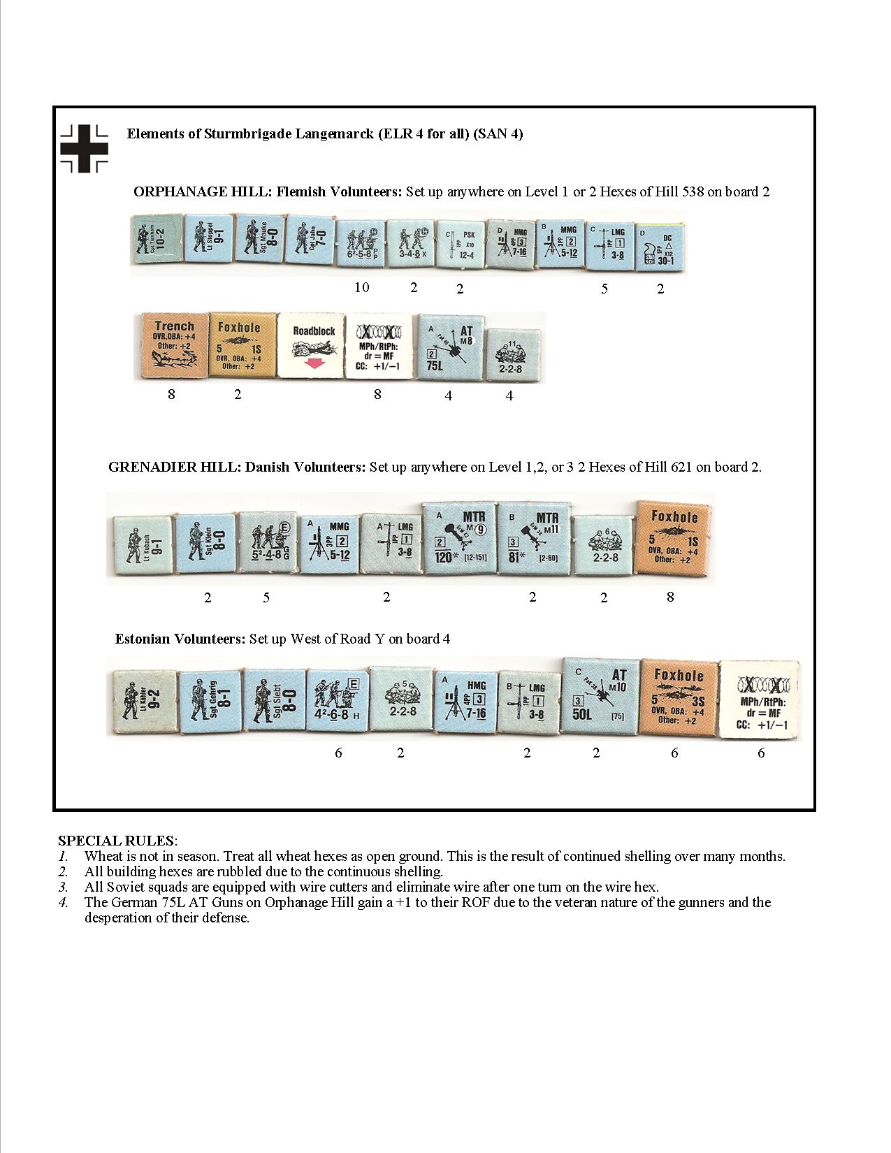 Months of intense combat has left the area around Narva a pitted, wreckage strewn landscape. On the Orphanage and Grenadier Hills, Danish, Estonian, and Flemish volunteers of Sturmbrigade Langemarck held on tenaciously against the blunt force attacks of the Soviet forces. In late July, the Soviet hammer-blows increased in their strength and ferocity. For the SS Volunteers it was becoming increasingly clear that their lines must eventually be breached. But they would not go easily into the dark good night...Attacker: Russian (109th Rifle Corps)