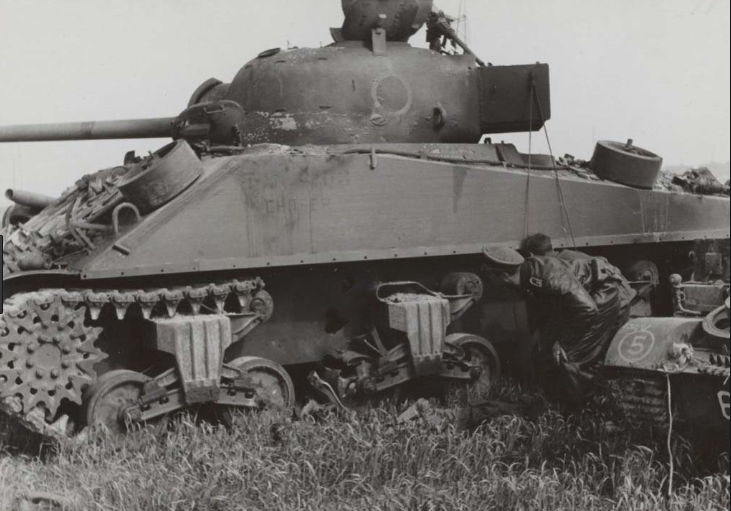 Sherman Firefly Vc T2102203 "Chaser" "C" squadron of the Sherbrooke Fusiliers outside Authie. Inspected by SS officer.