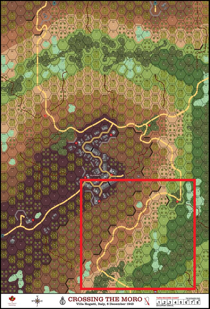 The Princess Patricia’s Light Infantry launched their attack on Villa Rogatti at midnight on 5-6 December. The plan called for each of the four companies and HQ, under cover of darkness, to cross the Moro River, one at a time, and make their way up a narrow wooded gully, attacking Villa Rogatti from the southeast. Intelligence reports identified the village to be heavily defended by Panzer Grenadiers dug into slit trenches in the surrounding orchards and vineyards, and lodged in buildings – heavily fortified into bunkers. As B Company approached the village, a machine-gun opened up from the high ground to their left. . .Attacker: Canadian (B Company, Princess Patricia's Canadian Light Infantry)