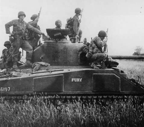 American infantry ride on 'Fury,' Tank F-2 of 'F' Company, 66th Armored Regiment