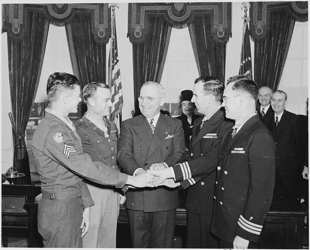 Lee (second from left) with President Truman (center) and other MoH recipients at their medal presentation ceremony