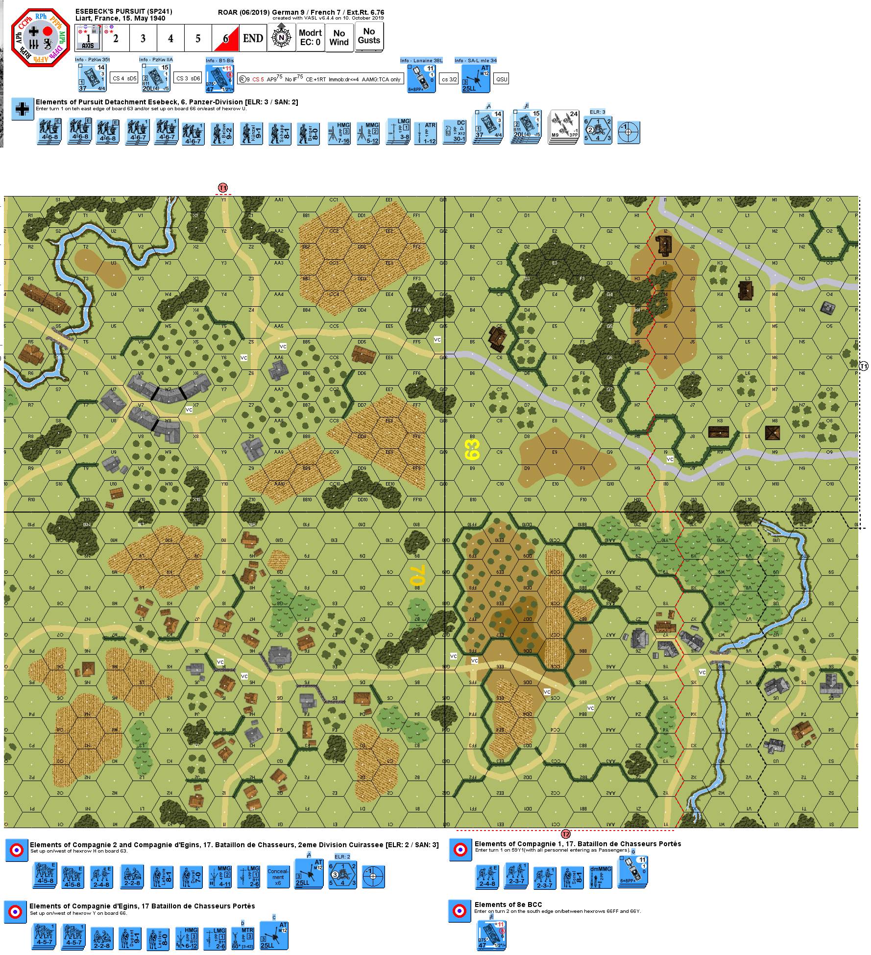 Elements of the 6th Panzer Division supported by Pz 35(t)s and Pz IIAs attack to clear one of two road segments defended by French infantry supported by Char B1 Bis tanks and 25LL AT guns.Attacker: German (Elements of Pursuit Detachment Esebeck, 6. Panzer Division)