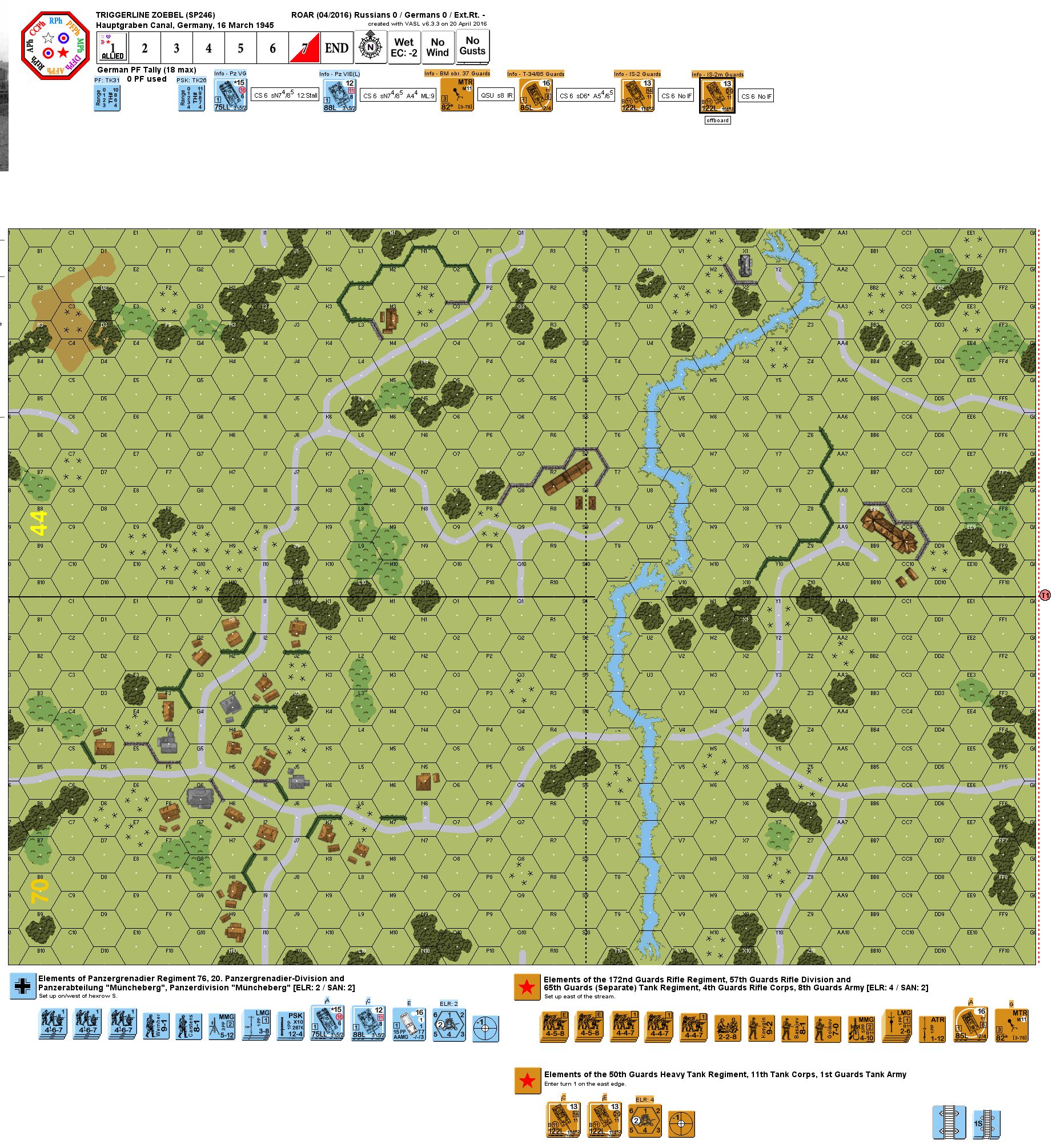 Chuikov’s 8th Guards Army was advancing through lowland, crisscrossed by canals and streams, known as Oderbruch. They had to negotiate the marshy terrain confined to Reichsbahn 1, the area’s main paved road, in order to seize the Seelow Heights. Upon reaching the flooded Hauptgraben Canal, the Russian lead elements found the bridged destroyed and under fire from Tiger and Panther tanks from Panzer Division Muncheberg, along with supporting infantry from Panzer Grenadier Division 20. Russian engineers worked feverishly to complete bridges across the Hauptgraben while Stalin and T-34 tanks at idling on Reichsbahn 1, exposed to enemy fire. Utilizing improved footbridges, Russian infantry began to filter across the canal. Once the engineers had completed a pontoon bridge, Russian tanks began to surge forward again. . .Attacker: Russian (Elements the 57th Guards Rifle Division and 50th Guards Heavy Tank Regiment)