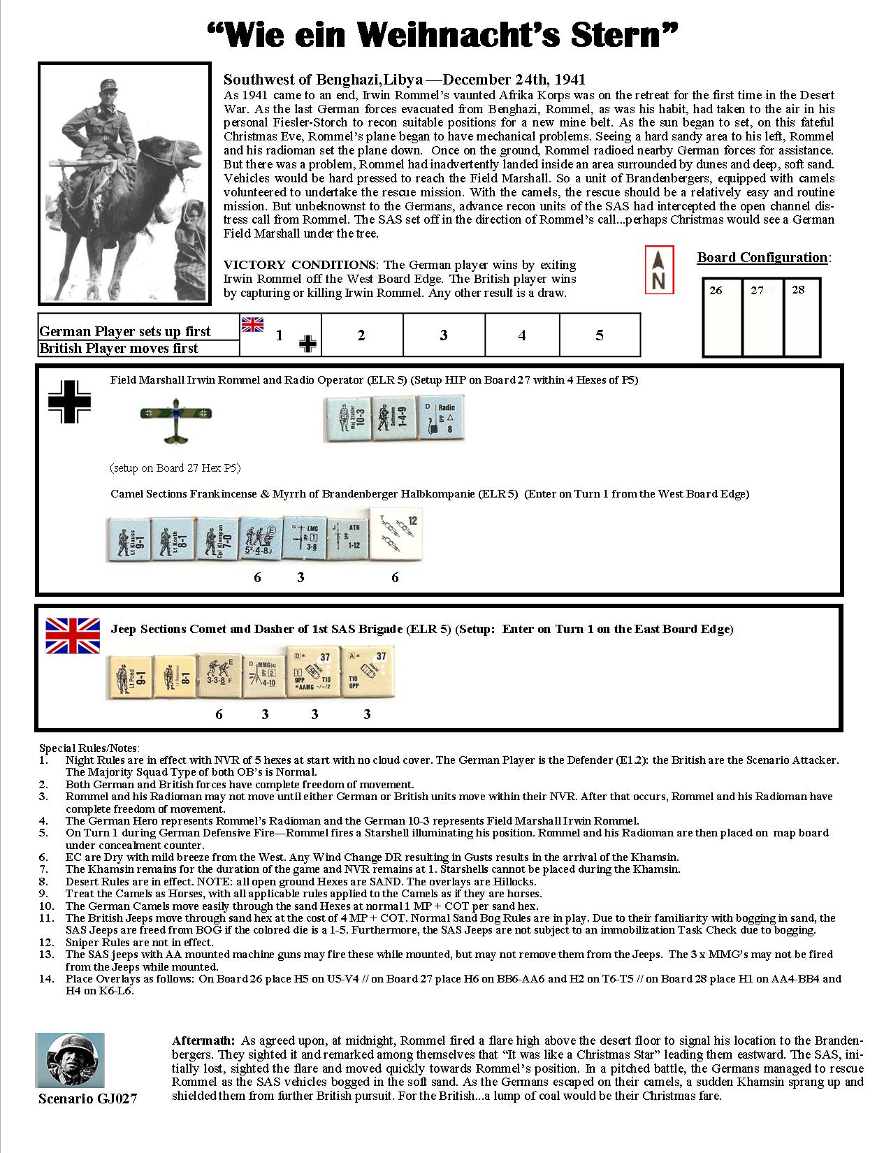 As 1941 came to an end, Erwin Rommel’s vaunted Afrika Korps was on the retreat for the first time in the Desert War. As the last German forces evacuated from Benghazi, Rommel, as was his habit, had taken to the air in his personal Fiesler-Storch to recon suitable positions for a new mine belt. As the sun began to set, on this fateful Christmas Eve, Rommel’s plane began to have mechanical problems. Seeing a hard sandy area to his left, Rommel and his radioman set the plane down. Once on the ground, Rommel radioed nearby German forces for assistance. But there was a problem, Rommel had inadvertently landed inside an area surrounded by dunes and deep, soft sand. Vehicles would be hard pressed to reach the General. So a unit of Brandenbergers, equipped with camels volunteered to undertake the rescue mission. With the camels, the rescue should be a relatively easy and routine mission. But unbeknownst to the Germans, advance recon units of the SAS had intercepted the open channel distress call from Rommel. The SAS set off in the direction of Rommel’s call...perhaps Christmas would see a German General under the tree.Attacker: British (1st SAS Brigade)