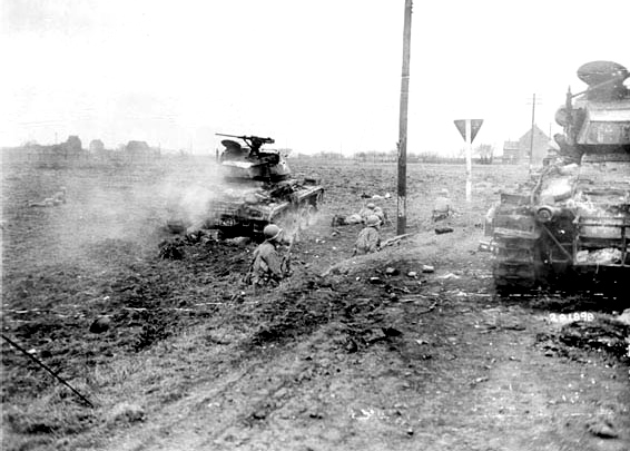 Fighting alongside a smoldering M24 tank at Rheinberg