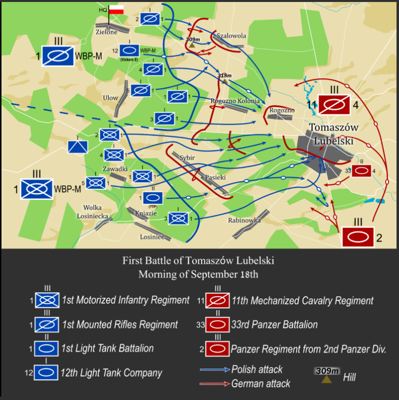 After more than a week of fighting, the situation had become confusing, resulting in a lack of coordination between many Polish units. The Southern Front containing Army Krakow and Army Malopolska, was created on 10 September in an effort to control the situation. Its situation then deteriorated badly on 12 September. The 2nd Panzer Division made a breakthrough and penetrated to the north, nearly unopposed, and started an encirclement. The Polish forces had to fall back to escape the encirclement and it was decided that the Warsaw Mechanized Brigade would attack and seize Tomaszów Lubelski in an attempt to draw attention off the remaining forces who would attempt to fight their way back to Lemberg.Attacker: Polish (Reinforced elements Warsaw Mechanised Brigade)