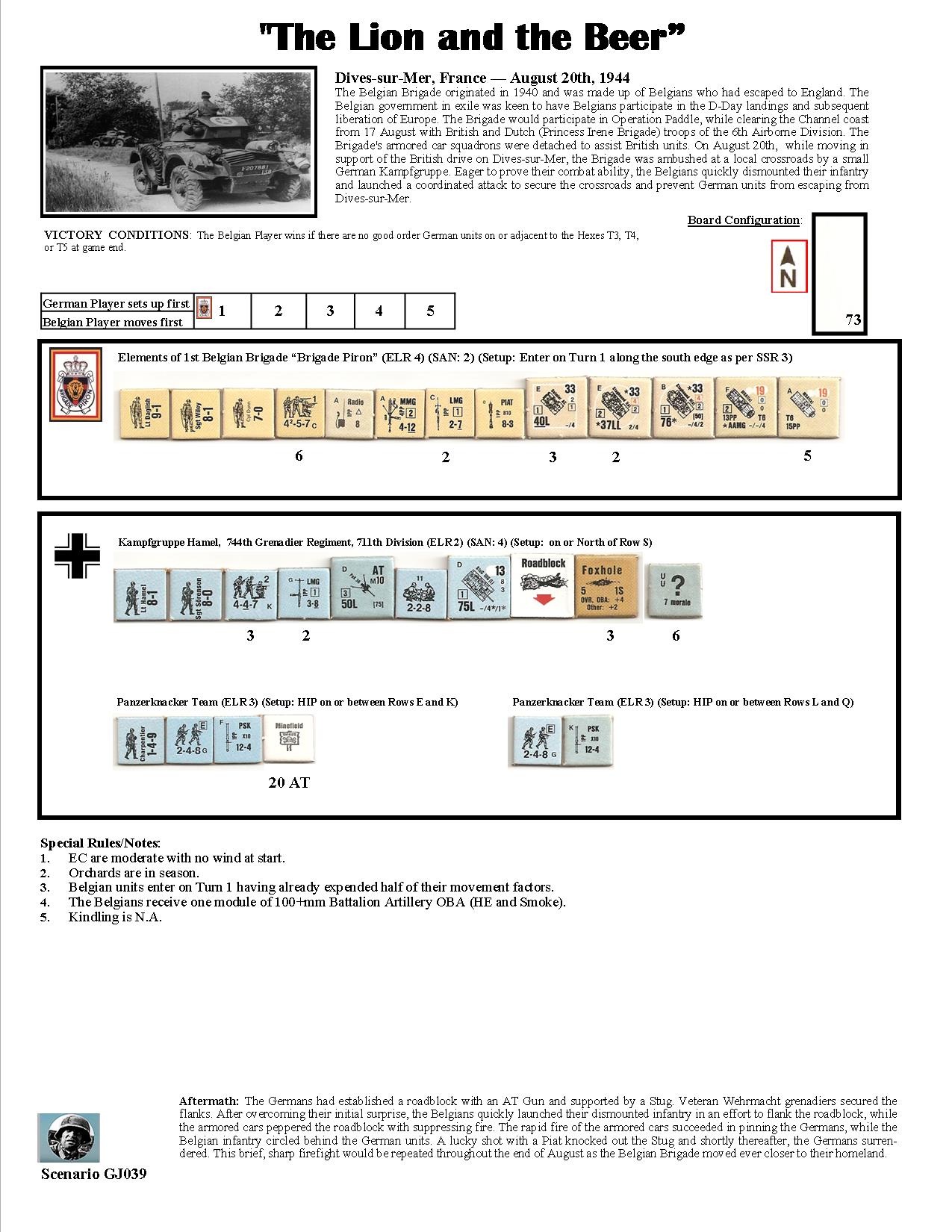 The Belgian Brigade originated in 1940 and was made up of Belgians who had escaped to England. The Belgian government in exile was keen to have Belgians participate in the D-Day landings and subsequent liberation of Europe. The Brigade would participate in Operation Paddle, while clearing the Channel coast from 17 August with British and Dutch (Princess Irene Brigade) troops of the 6th Airborne Division. The Brigade's armored car squadrons were detached to assist British units. On August 20th, while moving in support of the British drive on Dives-sur-Mer, the Brigade was ambushed at a local crossroads by a small German Kampfgruppe. Eager to prove their combat ability, the Belgians quickly dismounted their infantry and launched a coordinated attack to secure the crossroads and prevent German units from escaping from Dives-sur-Mer.Attacker: Belgian (1st Belgian Brigade "Brigade Piron")