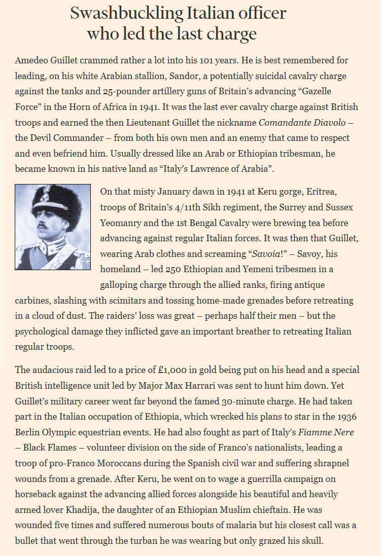 The sudden Italian retreat from Kasala had pushed the British prematurely on the offensive in Eritrea. As the Italians slipped away to Keru, the 4th Indian Division, spearheaded by Brigadier F. W. Messervy's motorised 'Gazelle Force' pursued. At Keru Gorge, Messervy found the road blocked by mines, demolitions, and the whole of General Fongoli's 41st Colonial Brigade. Under-estimating the enemy's strength, Messervy immediately launched an attack with the 4/11 Sikhs, supported by his field artillery. As the Sikhs became pinned down by the Italian defenders, a threat to the British gunners began to appear from behind. While the gunner's attention was fixed to the front,they were charged by a squadron of Ethiopian cavalry, led by two Italian officers on white horses.Attacker: Italian (41st Colonial Brigade)