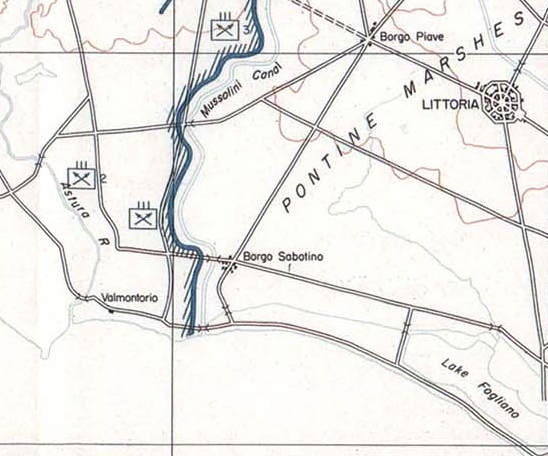 On February 1, the FSSF landed at the beachhead at Cisterna. The FSSF’s task was to hold and conduct raids from the right-hand flank of the beachhead marked by the Mussolini Canal and Pontine Marshes. After securing its position the first night, the FSSF’s 1st Regiment pushed patrols of No. 2 Company deep into the German front lines. Lt. Gus Heilman and his patrol crossed Bridge 1, south of Borgo Sabotino and pressed three miles eastward to the Fogliano Canal Lockhouse, where the Germans had a strongpoint.Attacker: American (2 Company, 1st Battalion, 3d Regiment, FSSF)