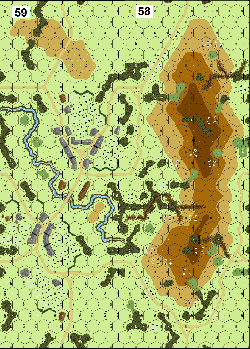 SS-Panzergrenadier Division 3 “Totenkopf” is attacking with PzIVF2s, PzIIIJs and supporting infantry to clear elements of the 244th Rifle Division from its board 58 hill defenses and the board 59 village.Attacker: German (SS) (Bataillons 1+2, SS-Panzergrenadier Regiment 1 and SS-Panzer Regiment 3, SS-Panzergrenadier Division 3 “Totenkopf”)