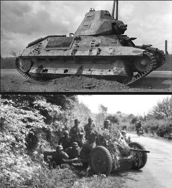 The French 55th Division was ordered to attack and recapture the Gaulier Bridge over the Meuse River that the Germans had captured in a previous days’ fighting. The western side of the German defense was a thin line of anti-tank guns. Lt. Beck-Broichsitter commanded an anti-tank platoon attached to the Großdeutschland Regiment. His forces covered a crossroads east of Connage and encountered a group of French tanks minutes away from the Gaulier Bridge.Attacker: French (55th Division)