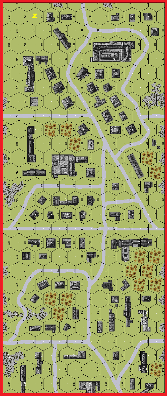 | Misc Rules: | Woods: Stone Rubble, Orchards: Shelholes. A: If a T-34 is eliminated, new one enters from South |