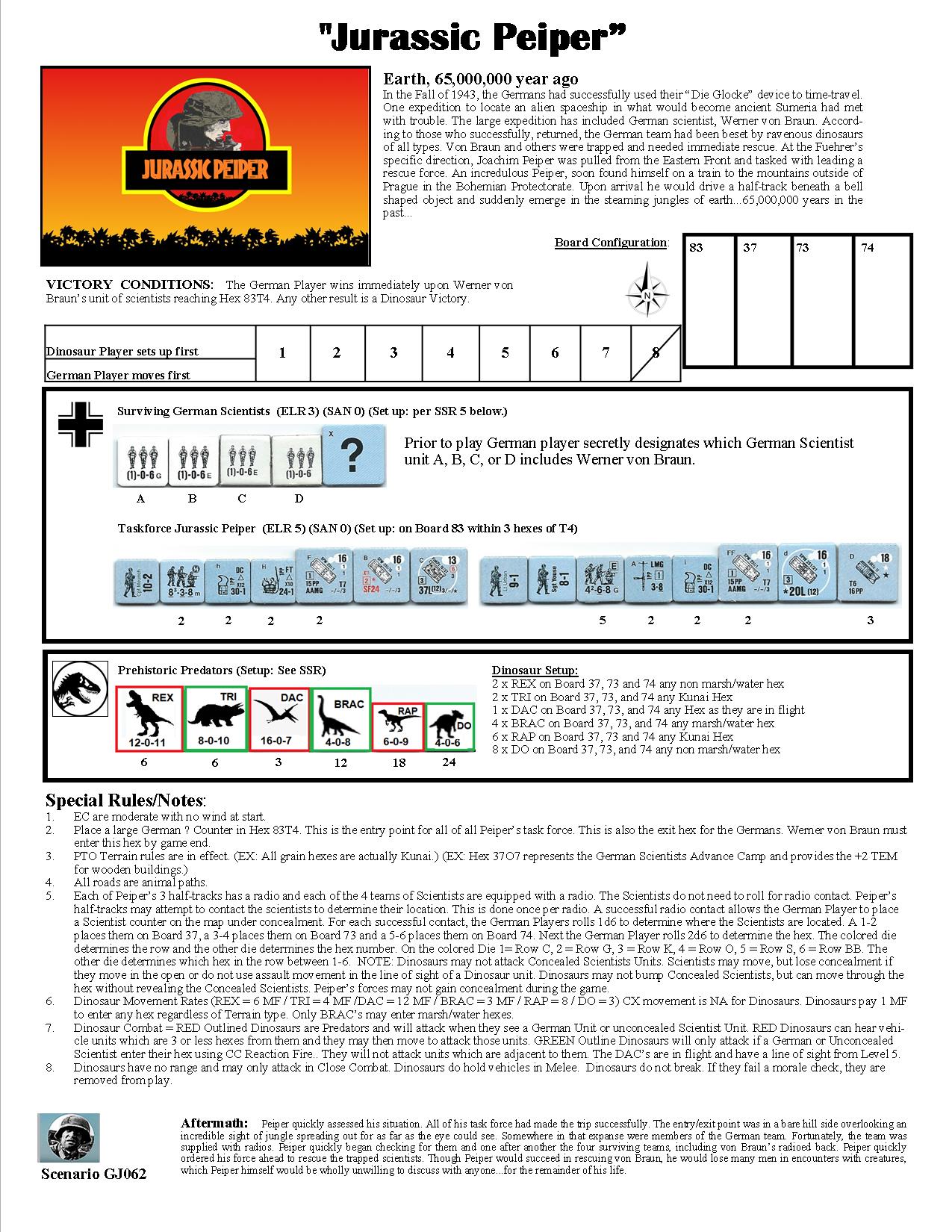In the Fall of 1943, the Germans had successfully used their “Die Glocke” device to time-travel. One expedition to locate an alien spaceship in what would become ancient Sumeria had met with trouble. The large expedition has included German scientist, Werner von Braun. According to those who successfully, returned, the German team had been beset by ravenous dinosaurs of all types. Von Braun and others were trapped and needed immediate rescue. At the Fuehrer’s specific direction, Joachim Peiper was pulled from the Eastern Front and tasked with leading a rescue force. An incredulous Peiper, soon found himself on a train to the mountains outside of Prague in the Bohemian Protectorate. Upon arrival he would drive a half-track beneath a bell shaped object and suddenly emerge in the steaming jungles of Earth...65,000,000 years in the past...Attacker: German (SS) (Taskforce Jurassic Peiper and Surviving German Scientists)