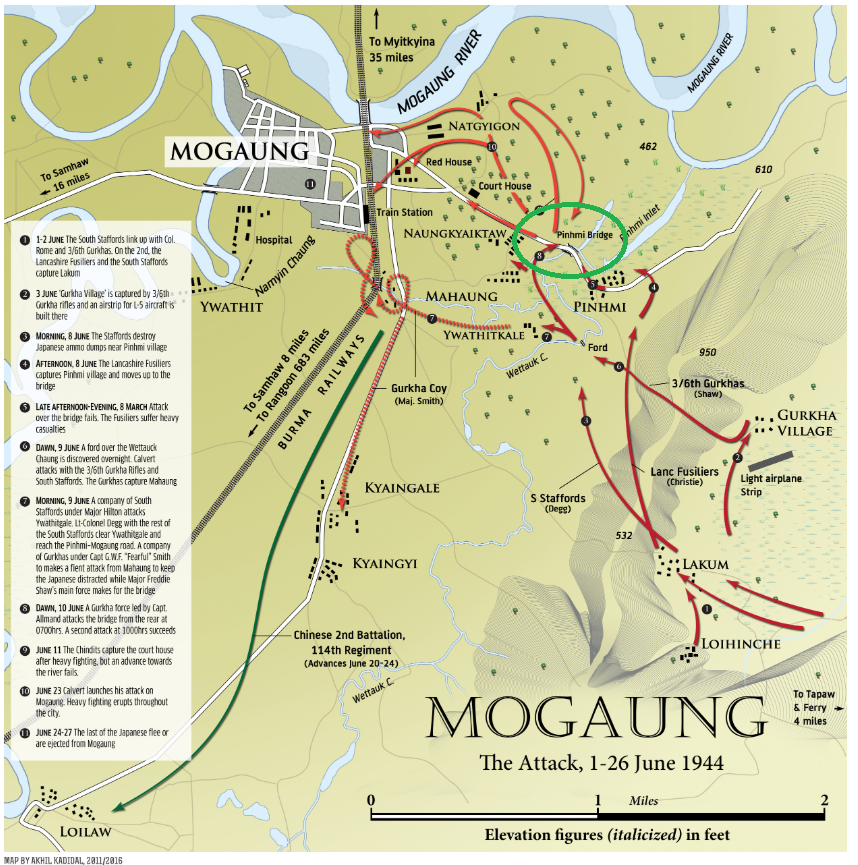 As the summer of 1944 began in earnest in Burma, the Chindits were busily destroying Japanese ammo supply depots on the paths towards Mogaung. Elements of the Japanese 114th Infantry Regiment were defending the approaches to Mogaung. One of the natural obstacles blocking movement toward Mogaung was the Wettauk Chaung Stream. The Stream was flooded, but could be crossed by the Pinhmi Bridge. Brigadier Michael Calvert elected to make his advance towards Mogaung by attempting to cross the bridge. Following a series of P-51 airstrikes and a mortar barrage, Calvert sent platoons of the 1st Lancashire Fusiliers to cross the bridge and proceed towards Mogaung. What Calvert couldn't see was that the Japanese were dug in right above the bridge.Attacker: Chindit (British) (1st Battalion, Lancashire Fusiliers)
