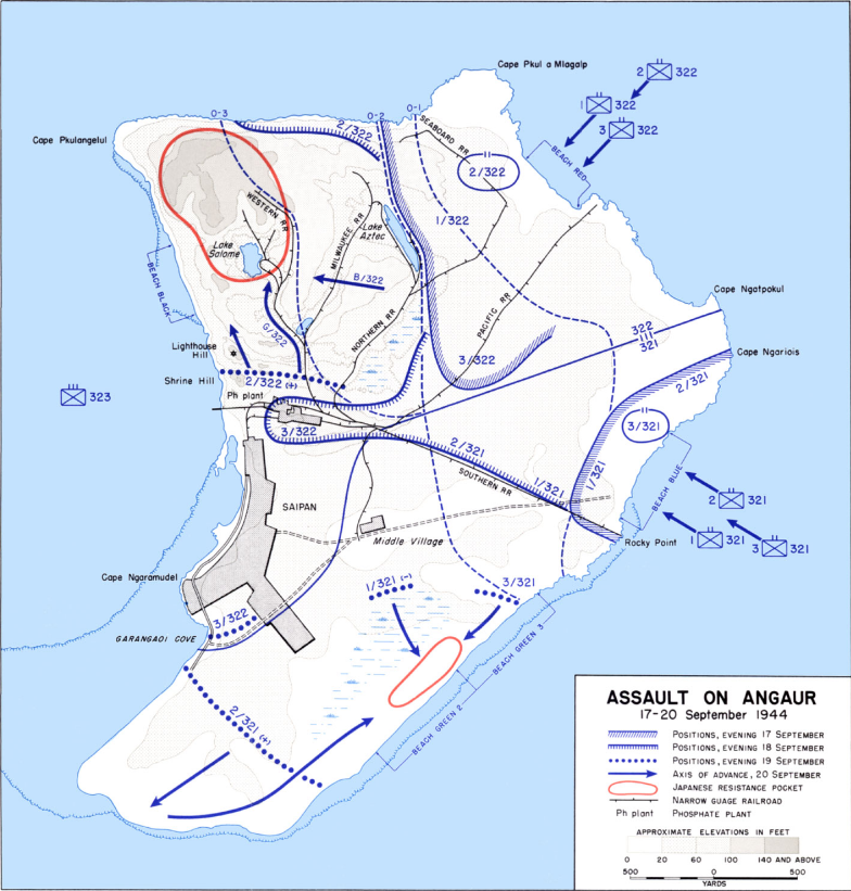 Anguar Island, near Peleliu which the Marines assaulted on 15 September, was to be assaulted only upon assurance that the resistance on Peleliu was well in hand. Marine General Rupertus gave the required assurance a mere day after the landings. Thus, the Army's 81st Infantry Division was set to invade the sideshow island of the Anguar on 17 September. Air reconnaissance had spotted defense construction activity on the southwestern beaches, so the Americans lands on the opposite side of the island, slicing through and capturing much of the island with relative ease. Major Ushio was forced to withdraw into the Romauldo Hills were the phosphate mines were.Attacker: American (322 Regimental Combat Team, 81st Infantry Division)