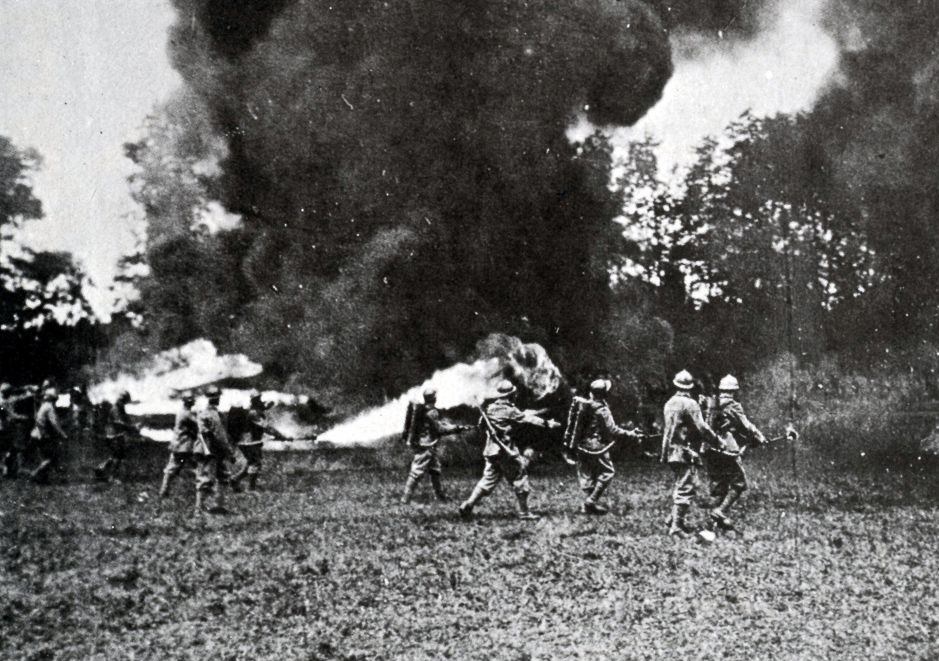 The Battle of Hooge represented one of the first major employments of the flamethrower, one of the most feared weapons introduced during World War I. Eleven days before the battle, British infantry had captured the German-occupied village of Hooge, located near Ypres in Belgium, by detonating a large mine. Using the flamethrowers to great effect, along with machine guns, trench mortars and hand grenades, the Germans reclaimed their positions on July 30, 1915, penetrating enemy front lines with ease and pushing the British forces back to their second trench. Though few men were lost to actual burns, a British officer reported later, the weapons had a great demoralizing effect, and when added to the assault of the other powerful weapons, they proved mercilessly efficient at Hooge.