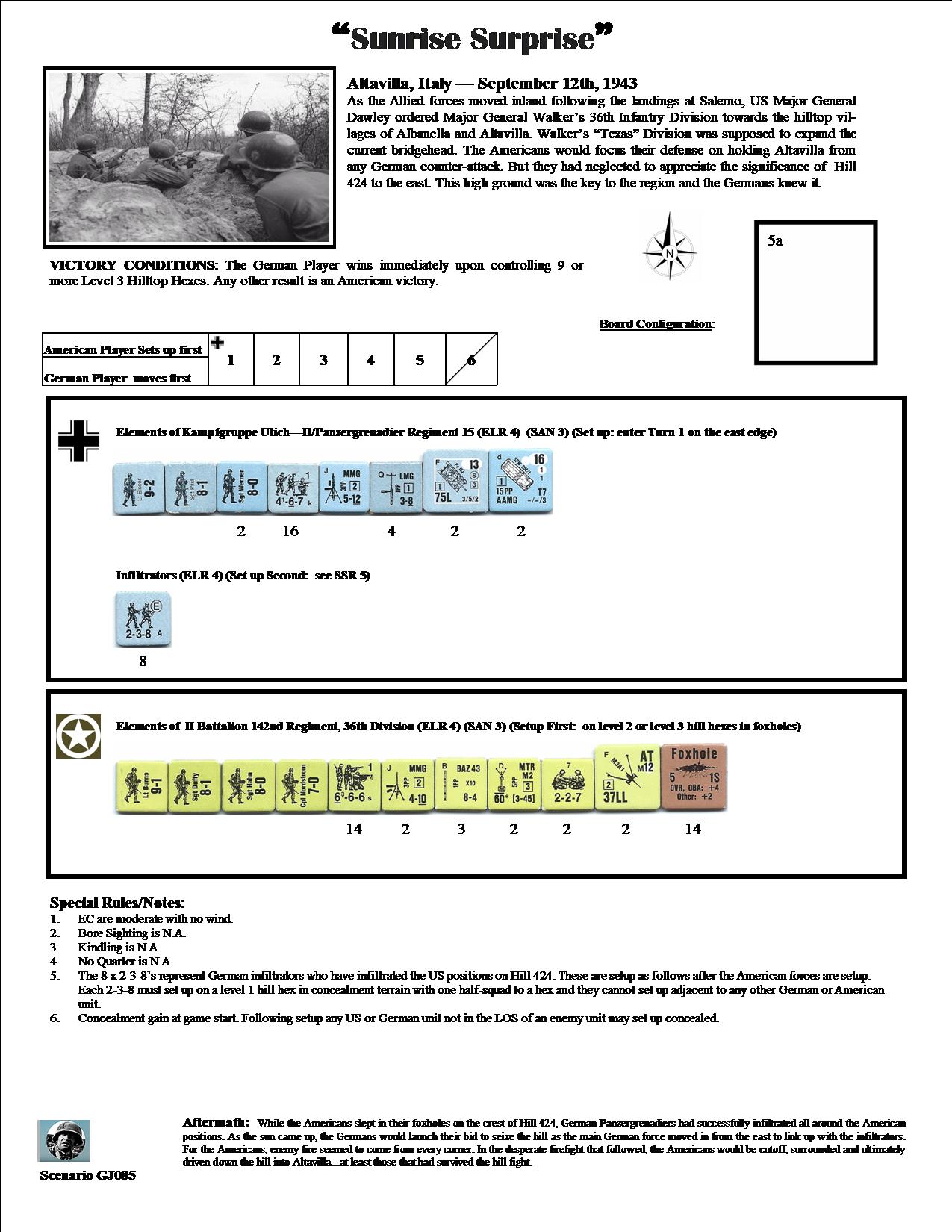 As the Allied forces moved inland following the landings at Salerno, US Major General Dawley ordered Major General Walker's 36th Infantry Division towards the hilltop villages of Albanella and Altaville. Walker's "Texas" Division was supposed to expand the current bridgehead. The Americans would focus their defense on holding Altaville fro any German counter-attack. But they neglected to appreciate the significance of Hill 424 to the east. This high ground was the key to the region and the Germans knew it. While the Americans slept in their foxholes on the crest of Hill 424, German panzergrenadiers had successfully infiltrated all around the American positions. As the sun came up, the Germans would launched their bid to seize the hill as the main German forces moved in from the east to link up with the infiltrators.Attacker: German (Kampfgruppe Ulich, II/Panzgergrenadier Regiment 15, 29th Panzergrenadier Division)