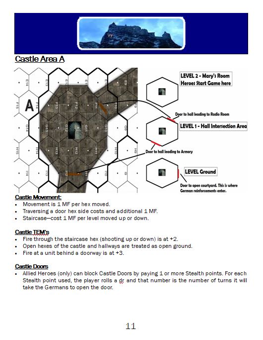Two American Communications Officer, Major Hallet and Captain Kleinschmidt have fallen into German hands. They have intimate knowledge of the planned radio transmissions scheduled for June, 1944, which will alert the French Resistance to begin actions in support of the Allied Invasion of Europe. The Germans intend to interrogate the two Americans and secure this information. Should Hallet and Kleinschmidt talk, the time-table for the Allied Invasion could be set back several months. Their rescue by a British/American strike-team is imperative. After parachuting into the snow-covered mountains around Werfen, Strike Team Broadsword entered the village of Werfen only to be betrayed by 3 double agents within its ranks. Broadsword’s Leaders Major Smith and Captain Schaeffer managed to escape the Germans and with the help of Mary, entered Schloss Hohenwerfen.Attacker: Allied (Broadsword Strike Team)