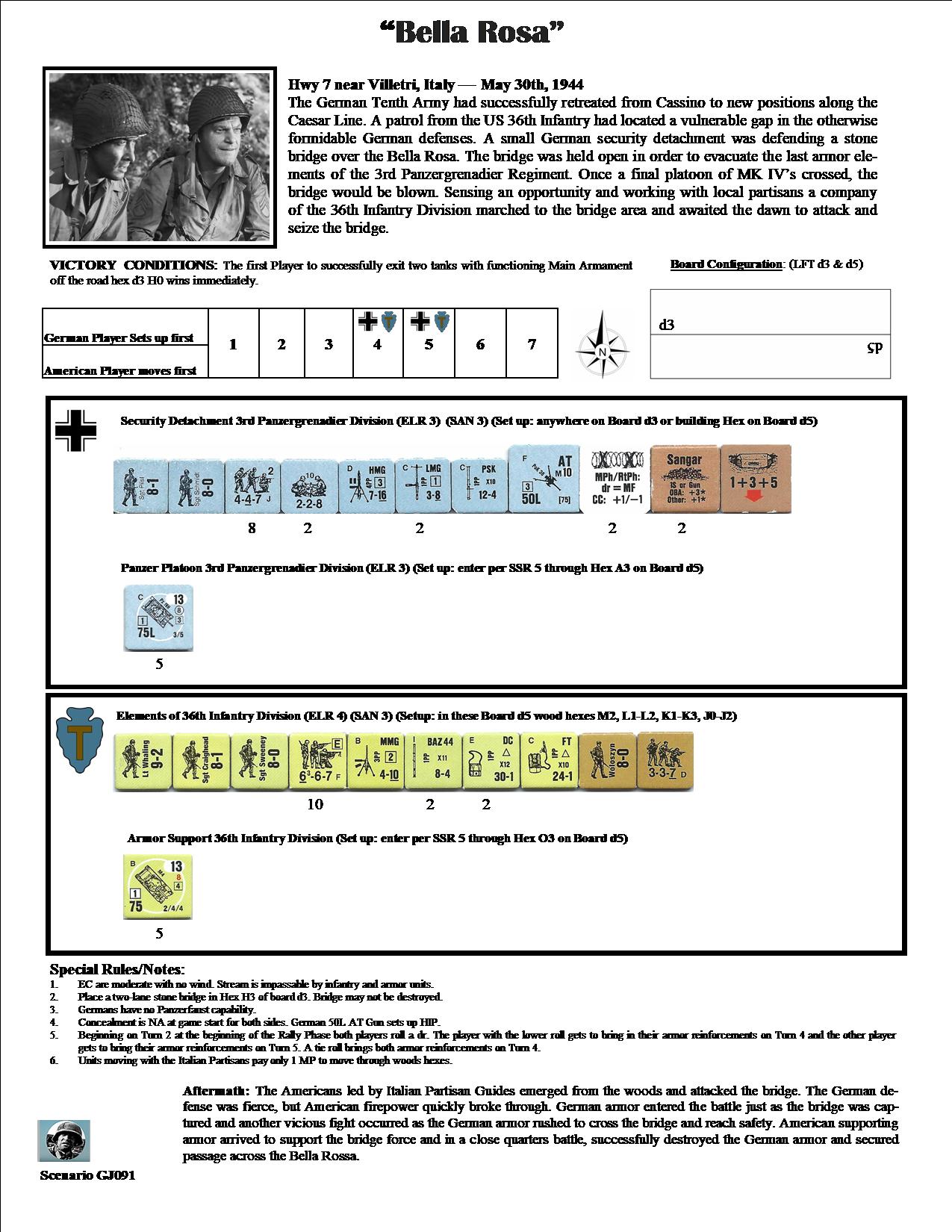 The German 10th Army had successfully retreated from Cassino to new positions along the Caesar Line. A patrol from the US 36th Infantry Division had located a vulnerable gap in the otherwise formidable German defenses. A small German security detachment was defending a stone bridge over the Bella Rosa. The bridge was being held open to evacuate the remaining armor of the 3rd Panzergrenadier Regiment. Once a final platoon of Mk IV’s crossed, the bridge would be blown. Sensing an opportunity and working with local Italian Partisans, a company of the 36th Infantry Division marched towards the bridge area and awaited the dawn to attack and seize the bridge.Attacker: American / Partisan (36th Infantry Division with Armor Support and Italian Partisans)