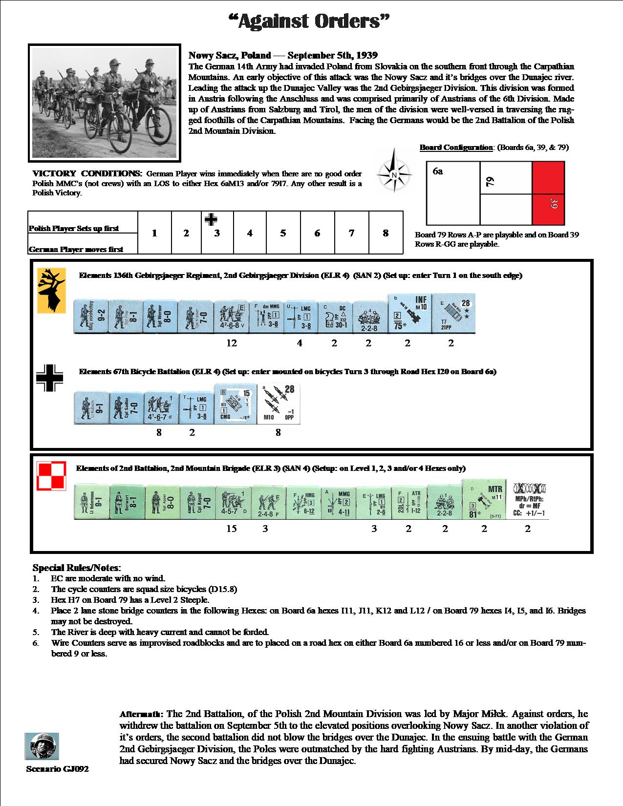 The German Army had invaded Poland from Slovakia on the southern front through the Carpathian Mountains. An early objective of this attack was the Nowy Sacz and it's bridges over Dunajec River. Leading the attack up the Dunajec valley was the 2nd Gebirgsjäger Division, this division was formed in Austria following the Anschluss and was comprised mainly of Austrians of the 6th Division. With Austrians from Salzburg and Tirol, the men in the division were well-versed in traversing the rugged foothills of the Carpathian Mountains. Facing the Germans would be the 2nd Battalion of the Polish 2nd Mountain Division.Attacker: German (136th Gebirgsjäger Regiment, 2nd Gebirgsjäger Division with 67th Bicycle Battalion)