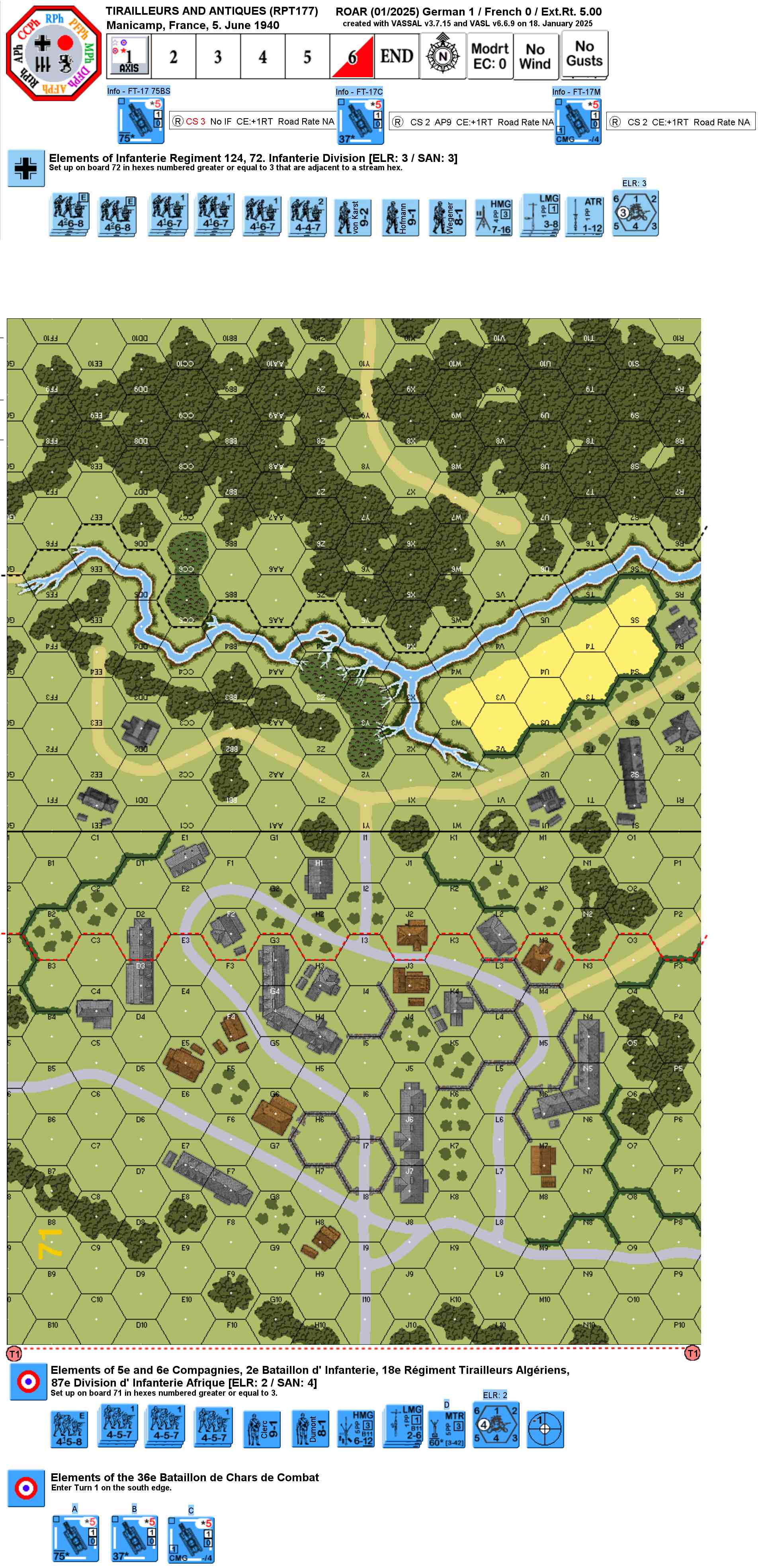 A German infantry company of fifteen squads from Infanterie Regiment 124, Infanterie Division 72 is attacking to clear the French from the wooden buildings of board 71’s village. Here, nine squads of the 18e Régiment Tirailleurs Algériens, 87e Division d’ Infanterie Afrique are defending with the help of three World War One vintage FT-17 tanks from 36e Bataillon de Chars de Combat.Attacker: German (Infanterie Regiment 124, Infanterie Division 72)