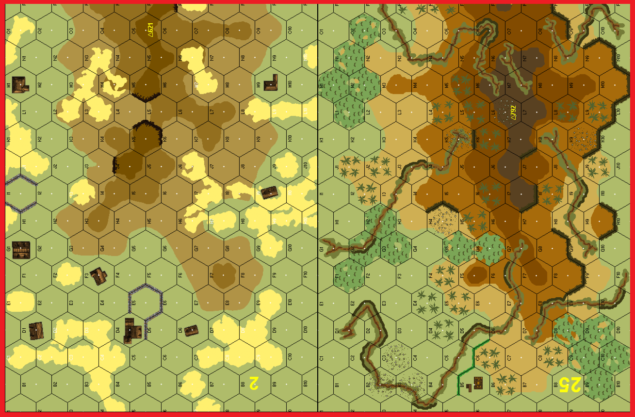 | Misc Rules: | PTO Terrain (G.1), DJ(2.2), Exc: Woods are Kunai, Hammada is OG, Crags are Palm Trees. Huts. Night. |