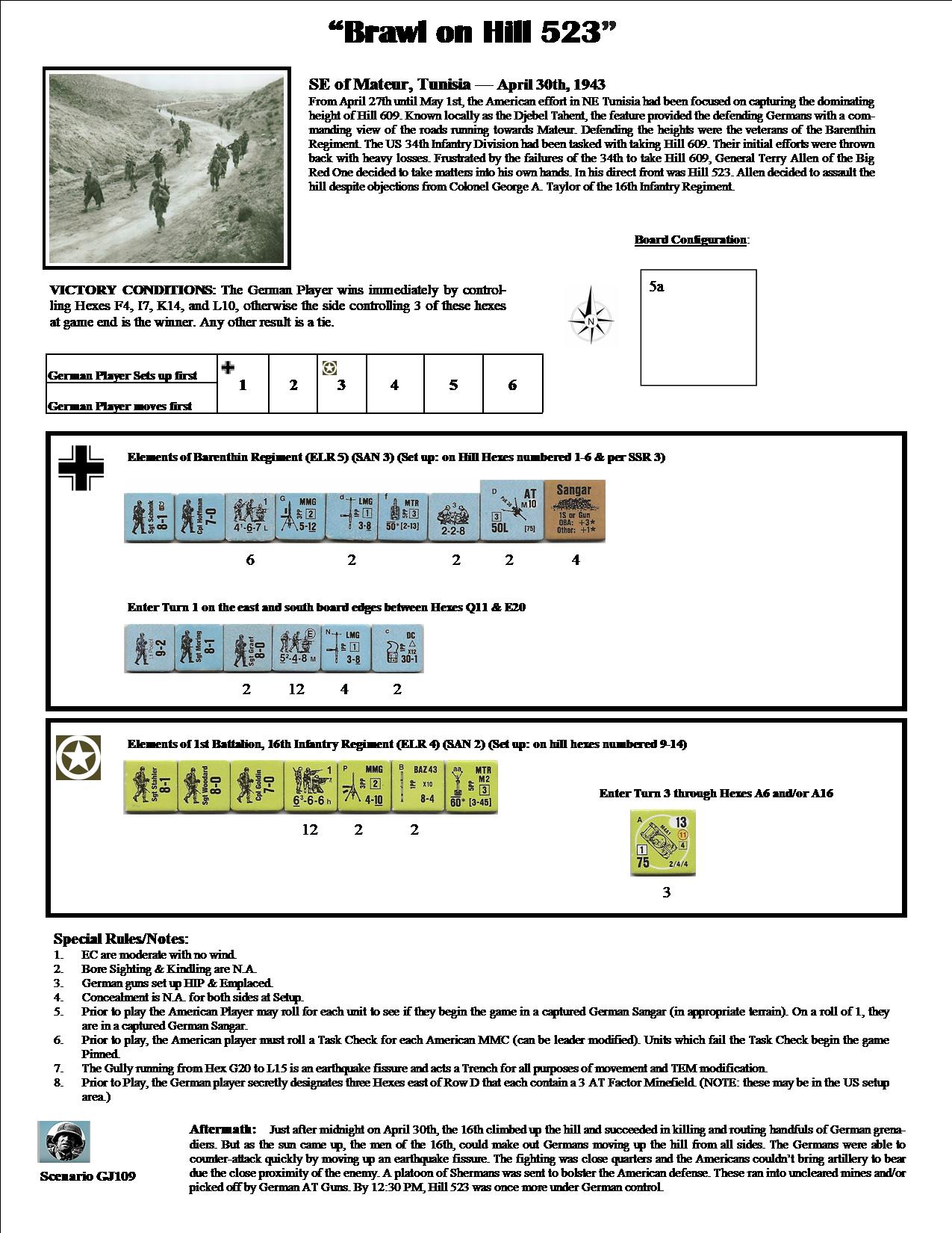 From April 27th until May 1st, the American effort in NE Tunisia had been forced on capturing the dominating height of Hill 609. Known locally as the Djebel Tahent, the feature provided the defending Germans with a commanding view of the roads towards Mateur. Defending the heights were veterans of the Barenthin Regiment. The US 34th Infantry Division had been tasked with the taking of Hill 609. Their initial efforts were thrown back with heavy losses. Frustrated by the failures of the 34th to take Hill 609, General Terry Allen of the Big Red One decided to take matters into his own hands. In his direct front was Hill 523. Allen decided to assault the hill despite objections from Colonel George A. Taylor of the 16th Infantry Regiment.Attacker: German (Barenthin Regiment)