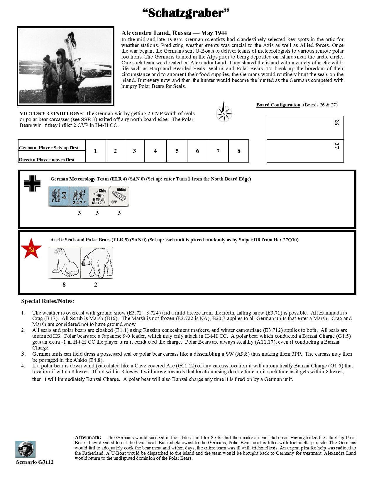 In the mid and late 1930's, German Scientists clandestinely selected key spots in the Arctic for Weather Stations. Predicting weather was as crucial to the Axis forces as it was to the Allieds. Once the war began, Germany sent U-Boats to deliver teams of Meteorologists to various remote polar locations. The Germans trained in the Alps prior to being deposited on the islands near the Arctic circle. One such team was located on Alexandra Land. They shared the island with a variety of Arctic wildlife such as Harp and Bearded Seals, Walrus and Polar Bears. To break up the boredom of their circumstances and to augment their food supplies, the Germans would routinely hunt the seals on the island. Every now and then, the hunter would become the hunted as they competed with the Polar Bears for the seals.Attacker: Russian (Polar Bears & Seals)