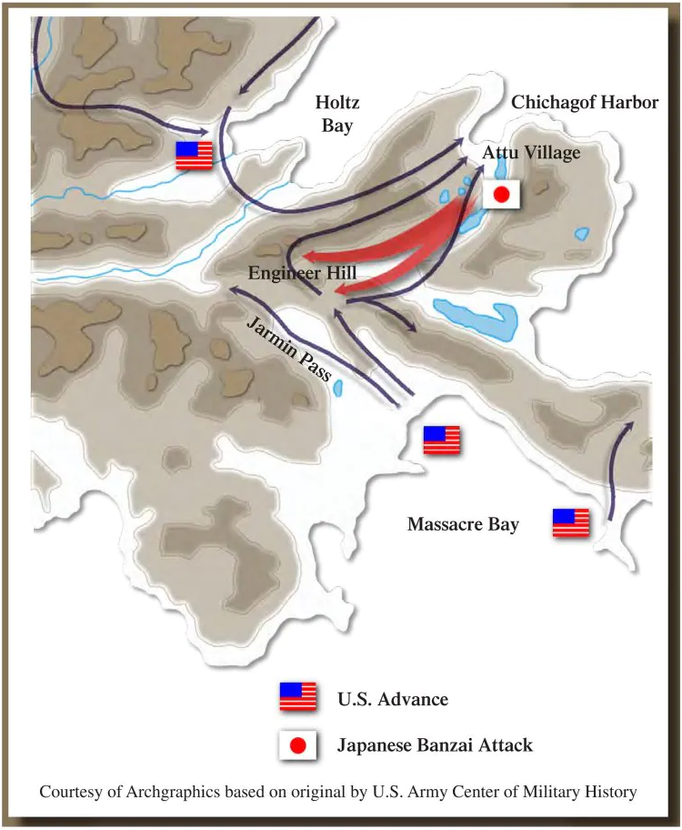 By the 28th of May, Colonel Yamasaki was running out of options, supplies, and manpower. Col. Yamasaki planned a final all-out attack against the American forces on Attu using the remaining 800 of so of his men that could still walk, crawl or otherwise even carry a stick. His men were now starving, running out of ammunition. The target of this attack was the American 105mm howitzer emplacements located on a hill overlooking Massacre Bay.Attacker: Japanese (303rd Independent Infantry Battalion)