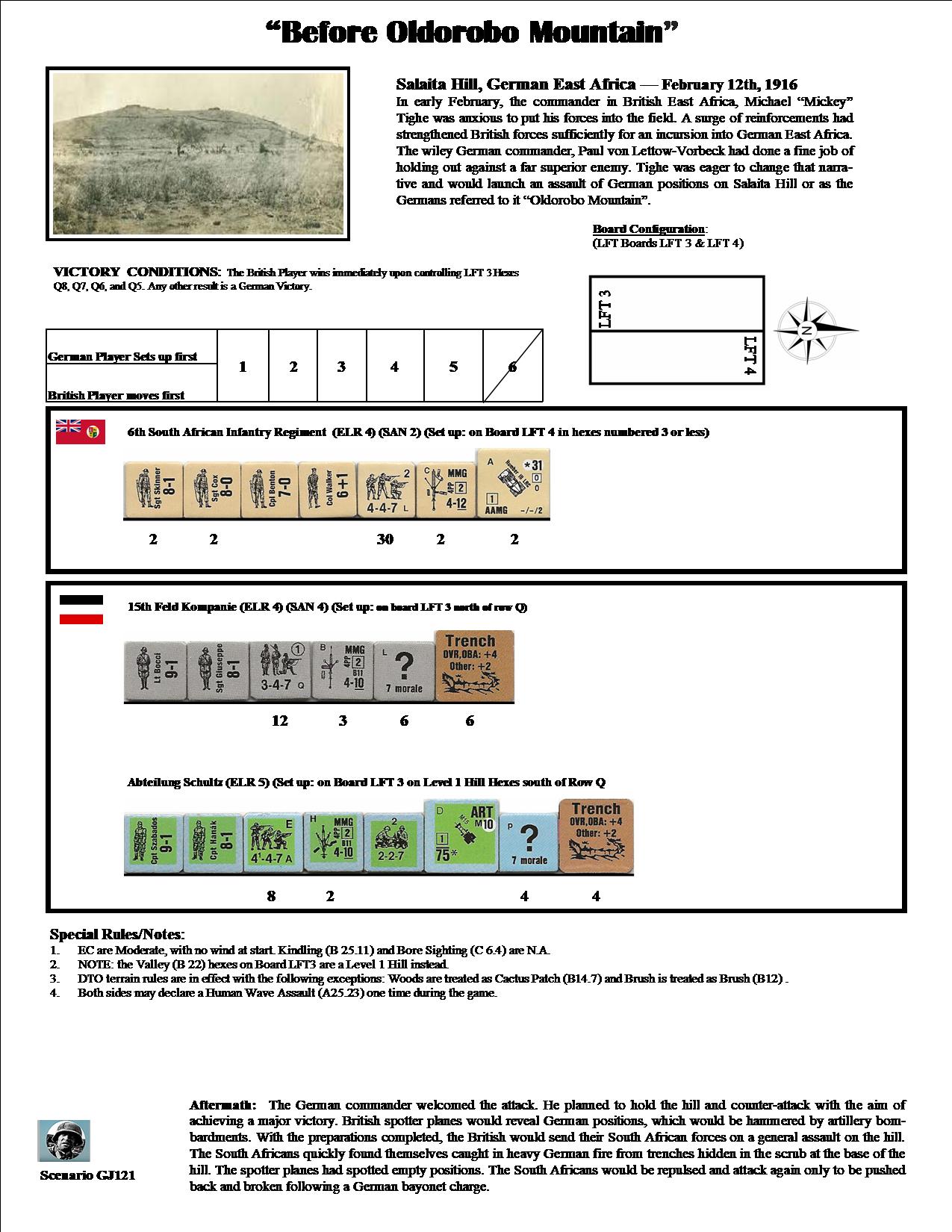 In early February, the commander in British East Africa, Michael "Mickey" Tighe was anxious to put his forces in the field. A surge of reinforcements had strengthened British forces sufficiently for an incursion into German East Africa. The wiley German commander, Paul von Lettow-Vorbeck had done a fine job of holding out against a far superior enemy. Tighe was eager to change that narrative and would launch an assault on German positions on Salaita Hill or as the Germans referred to it "Oldorobo Mountain."Attacker: British (6th South African Infantry Regiment)