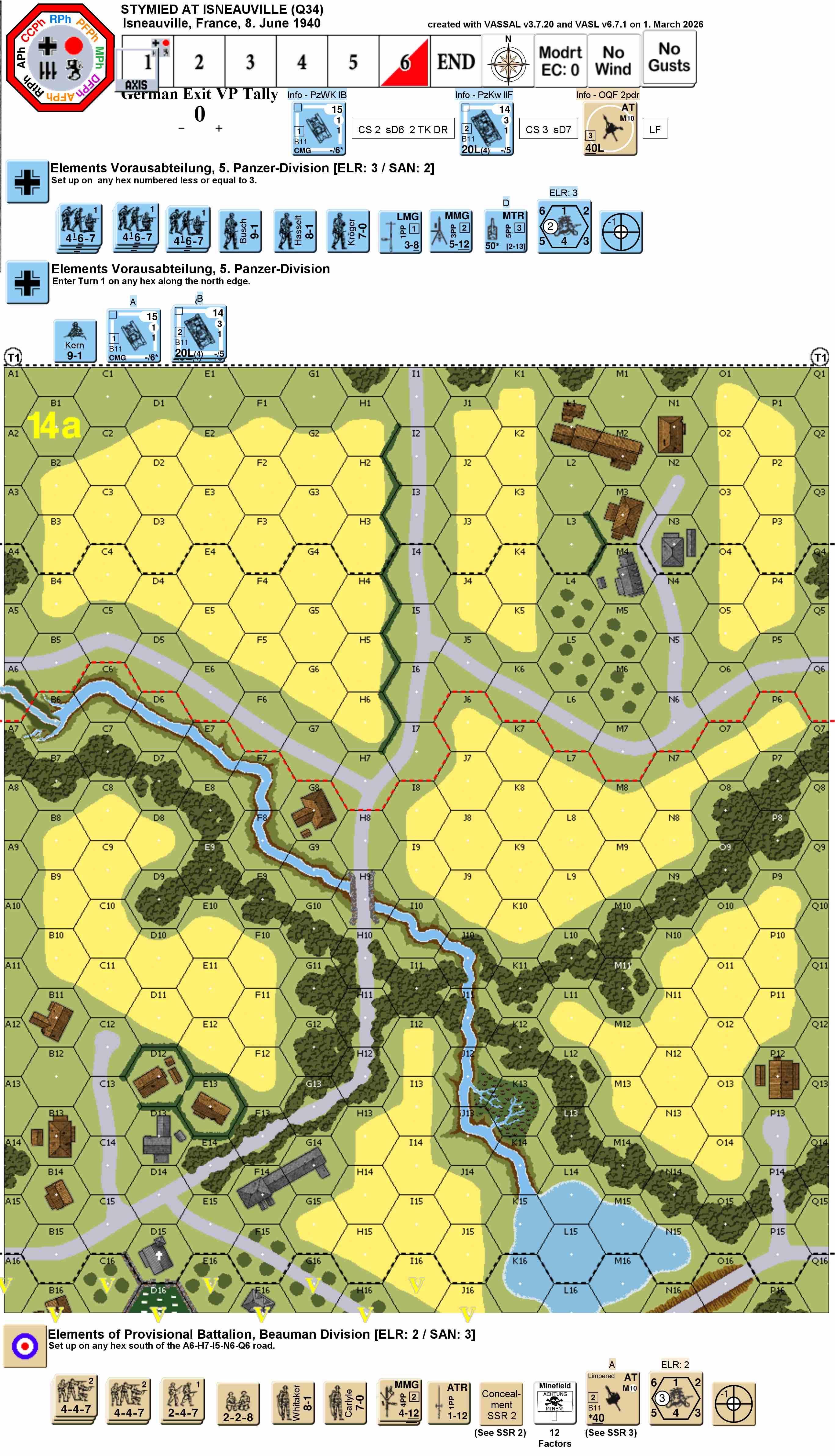 I played the Germans. First thing I got wrong was the exit area specified in the VC. A15 to J15 ONLY, i.e. West of the Pond ONLY. I believed that P15 & Q15 would also be an option, which was wrong. Next mistake: I set up the German tanks on board instead of having them enter in Turn 1. Misled by my original VASL file (I have corrected the version available here in the Scenario Archive by now.), my opponent believed in the exit possibility of P15 and Q15 as well.