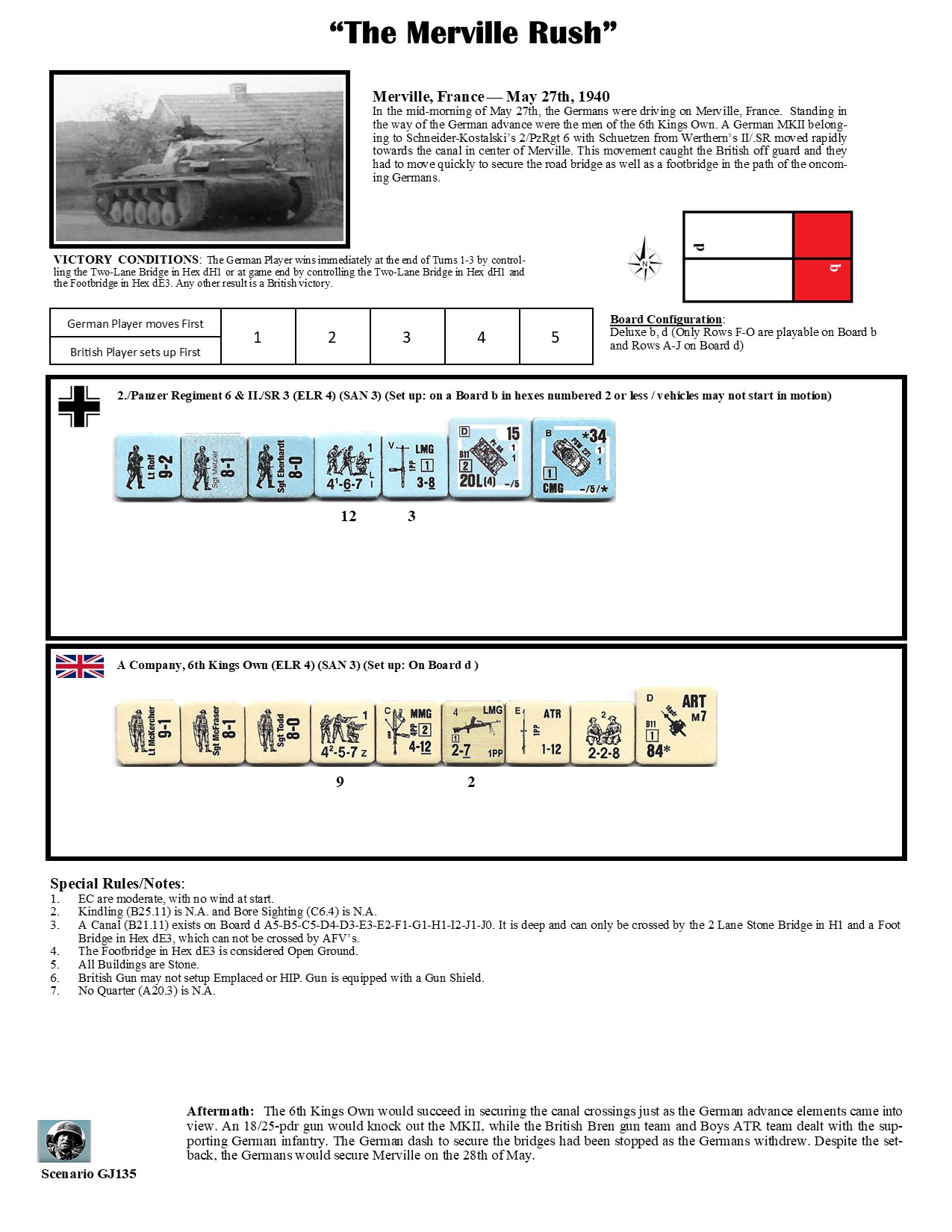 In the mid-morning of May 27th, the Germans were driving on Merville, France. Standing in the way of the German advance, were men of the 6th Kings Own. A German MkII belonging to Schneider-Kostalski's 2/PzRgt 6 with Schuetzen from Werthern's II/.SR moved rapidly towards the canal in the center of Merville. The movement caught the British off guard and they had to move quickly to secure the road bridge as well as the footbridge in the path of the oncoming Germans,Attacker: German (2./Panzer Regiment 6 & II./SR 3)