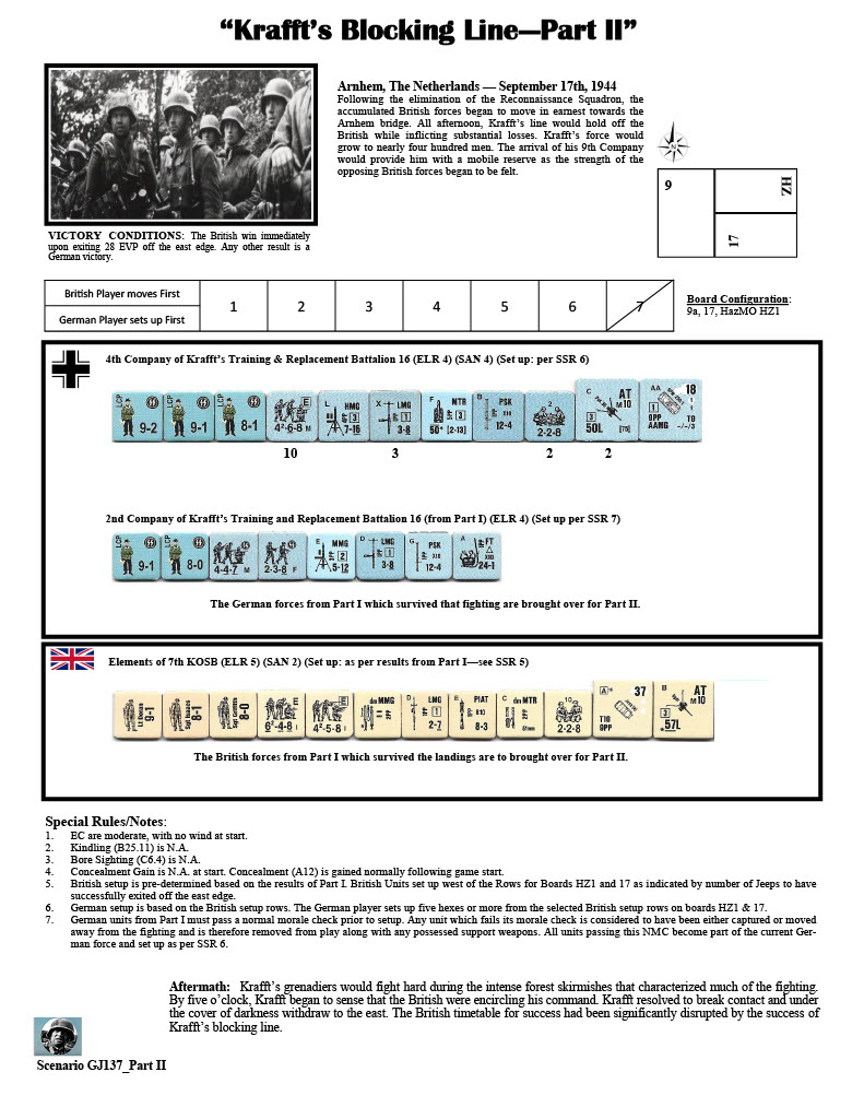 Part II-Following the elimination of the Reconnaissance Squadron, the accumulated British forces began to move in earnest towards the Arnhem bridge. All afternoon, Krafft’s line would hold off the British while inflicting substantial losses. Krafft’s force would grow to nearly four hundred men. The arrival of his 9th Company would provide him with a mobile reserve as the strength of the opposing British forces began to be felt.Attacker: British (7th KOSB)