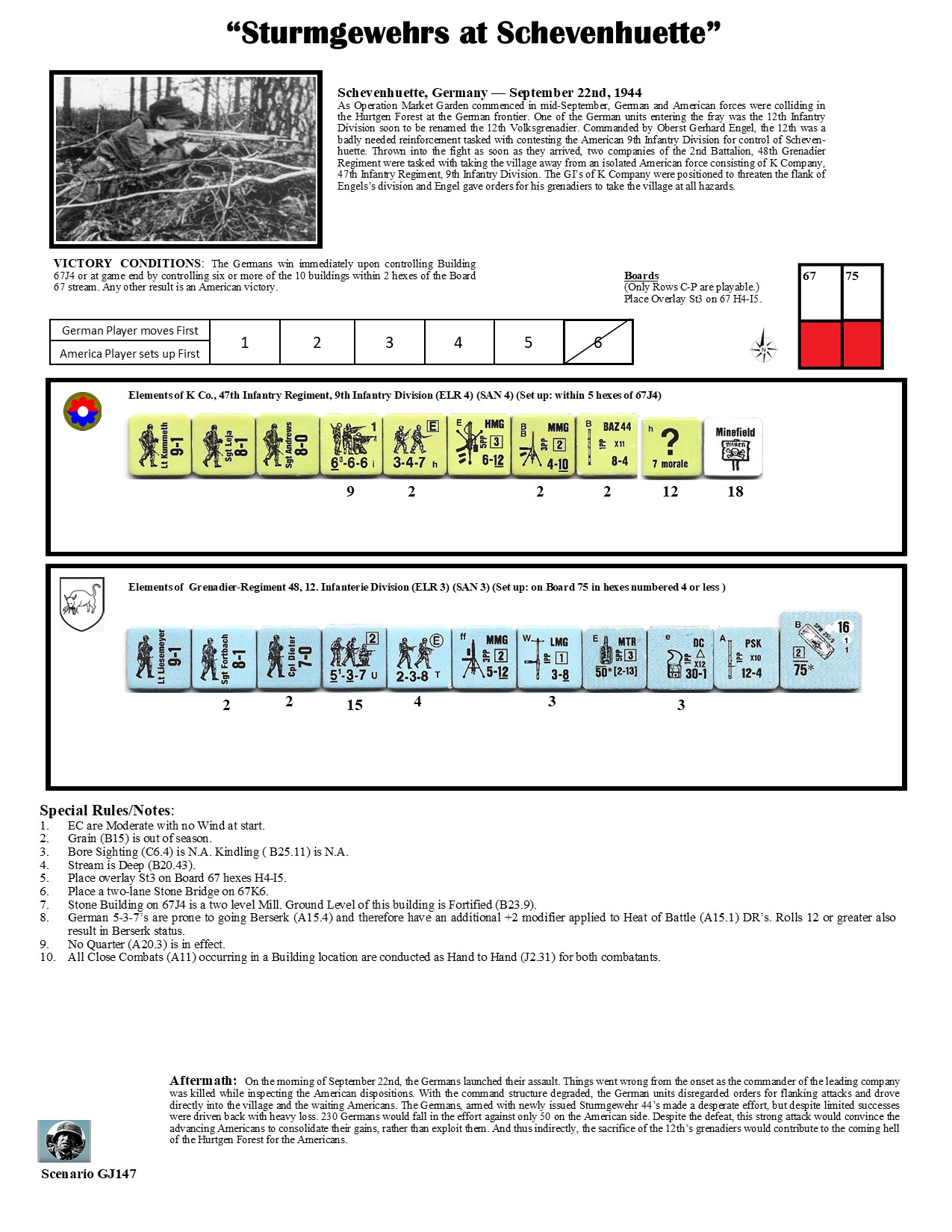 As Operation Market Garden commenced in mid-September, German and American forces were colliding in the Hurtgen Forest at the German frontier. One of the German units entering the fray was the 12th Infantry Division soon to be renamed the 12th Volksgrenadier. Commanded by Oberst Gerhard Engel, the 12th was a badly needed reinforcement tasked with contesting the American 9th Infantry Division for control of Schevenhuette. Thrown into the fight as soon as they arrived, two companies of the 2nd Battalion, 48th Grenadier Regiment were tasked with taking the village away from an isolated American force consisting of K Company, 47th Infantry Regiment, 9th Infantry Division. The GI’s of K Company were positioned to threaten the flank of Engels’s division and Engel gave orders for his grenadiers to take the village at all hazards.Attacker: German (Grenadier Regiment 48, 12 Infanterie Division)